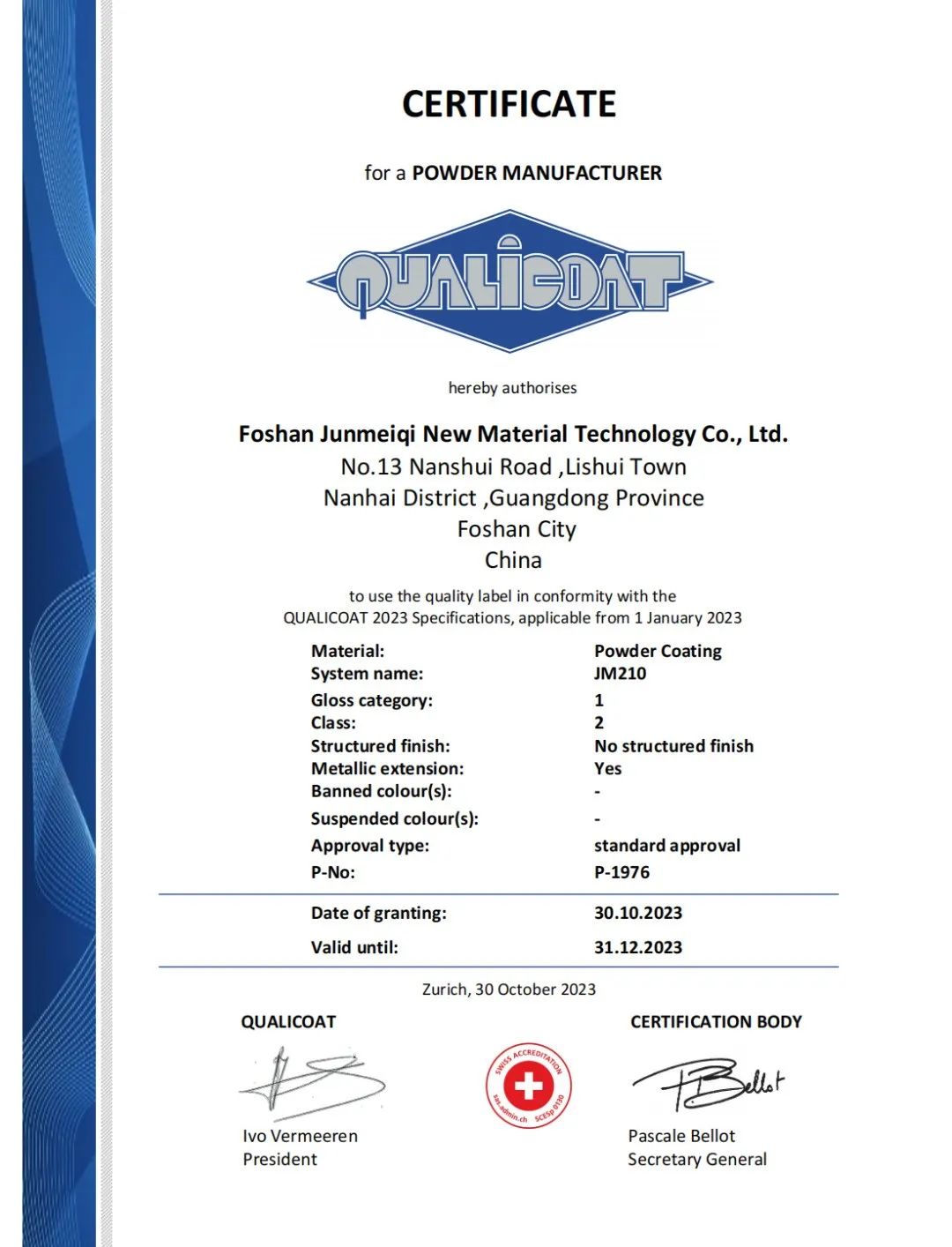 除此之外,近日俊美琪再度傳來喜訊,公司的產(chǎn)品JM210順利通過QUALICOAT二類粉認(rèn)證,認(rèn)證編號(hào)為P-1976。成為目前國內(nèi)通過此項(xiàng)認(rèn)證少有的幾家公司之一。