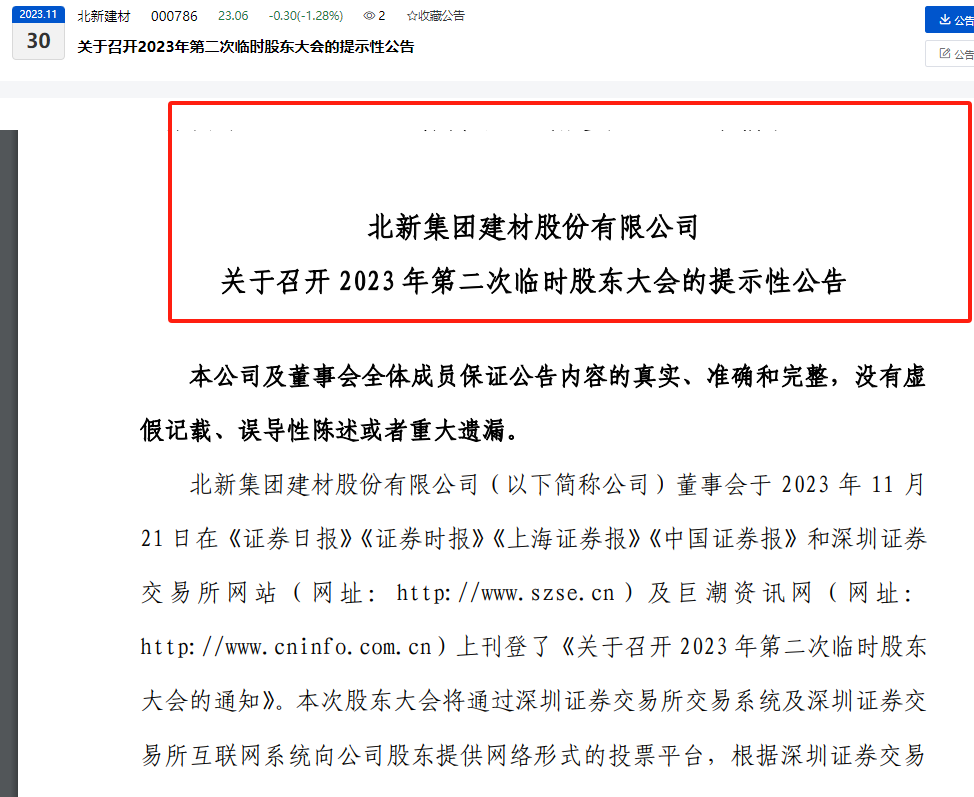 2023年11月30日,北新集團(tuán)建材股份有限公司(下稱“北新建材”)對(duì)外發(fā)布《關(guān)于召開 2023年第二次臨時(shí)股東大會(huì)的提示性公告》。公告中指出,本次股東大會(huì)擬審議的提案包括關(guān)于修改公司章程的議案、關(guān)于修改《董事會(huì)議事規(guī)則》的議案和關(guān)于更換公司董事的議案?,F(xiàn)場會(huì)議召開時(shí)間:2023年12月6日(星期三)下午14:30。