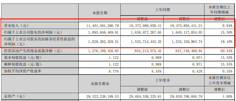 財(cái)報(bào)顯示,北新建材今年上半年實(shí)現(xiàn)營業(yè)收入114.02億元,同比增長8.84%;營業(yè)利潤 20.06億元,同比增長17.91%;利潤總額20億元,同比增長17.79%;凈利潤19.03億元,同比增長15.91%;歸屬于上市公司股東的凈利潤18.96億元,同比增長15.58%;歸屬于上市公司股東的扣除非經(jīng)常性損益的凈利潤18.29億元,同比增長19.16%。