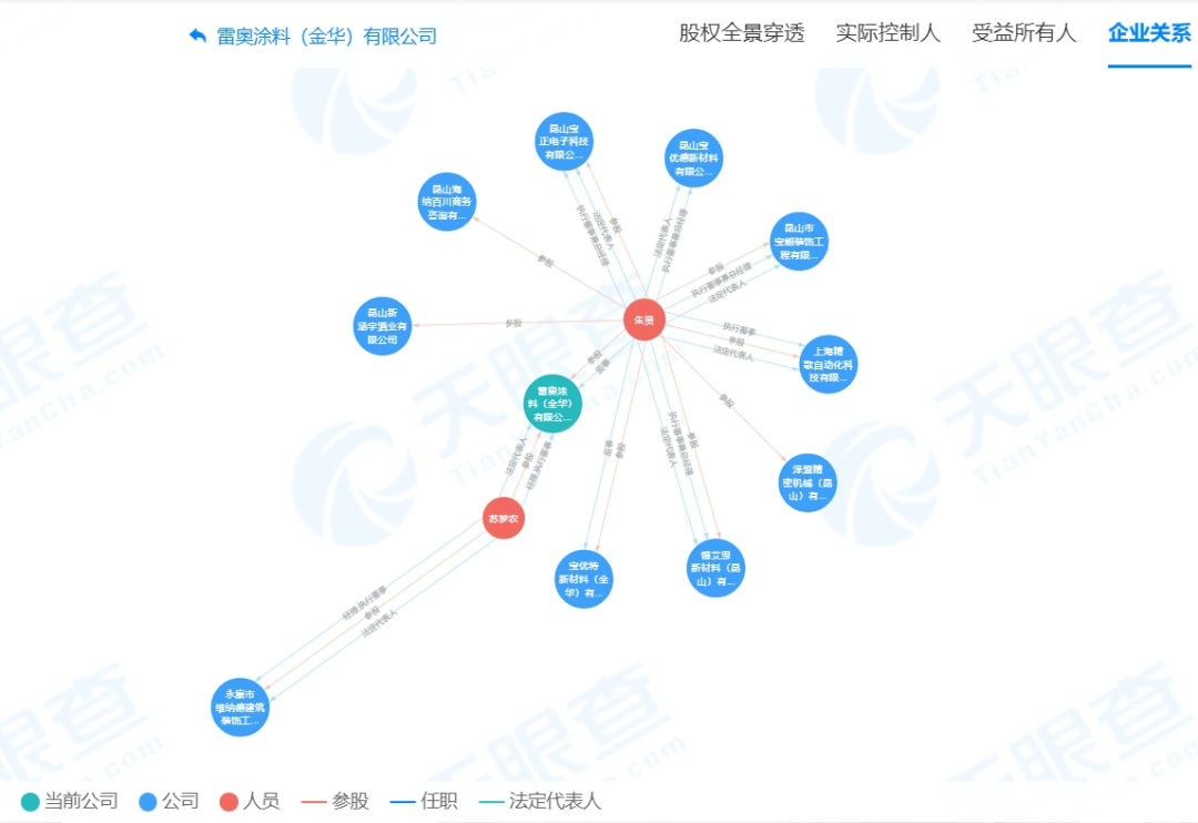 通過(guò)股權(quán)結(jié)構(gòu)可以看到,雷奧涂料實(shí)際控股人為朱賢,占股90%;除了雷奧涂料,朱賢還控股了艾思新錫艾思新材料(昆山)有限公司(曾用名:昆山正光化工有限公司)、上海精歌自動(dòng)化科技有限公司、昆山市寶能裝飾工程有限公司、寶優(yōu)特新材料(金華)有限公司等多家公司。