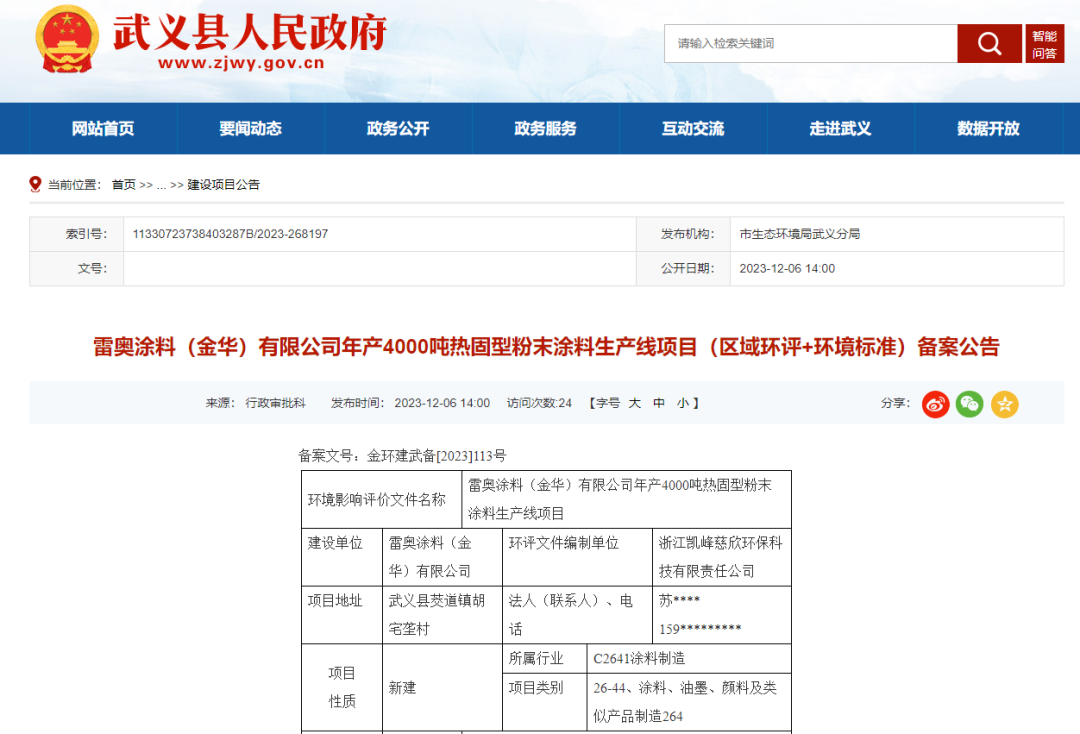 2023年12月6日,浙江省金華市生態(tài)環(huán)境局武義分局對(duì)外發(fā)布《雷奧涂料(金華)有限公司年產(chǎn)4000噸熱固型粉末涂料生產(chǎn)線(xiàn)項(xiàng)目(區(qū)域環(huán)評(píng)+環(huán)境標(biāo)準(zhǔn))備案公告》。