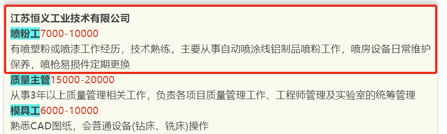 此前,江蘇恒義就曾就招聘噴粉工開出7000-10000元/月的工資價格。要求有噴塑粉或噴漆工作經(jīng)歷,技術熟練。日常工作內容就是主要從事自動噴涂線鋁制品噴粉工作,噴房設備日常維護保養(yǎng),噴槍易損件定期更換。