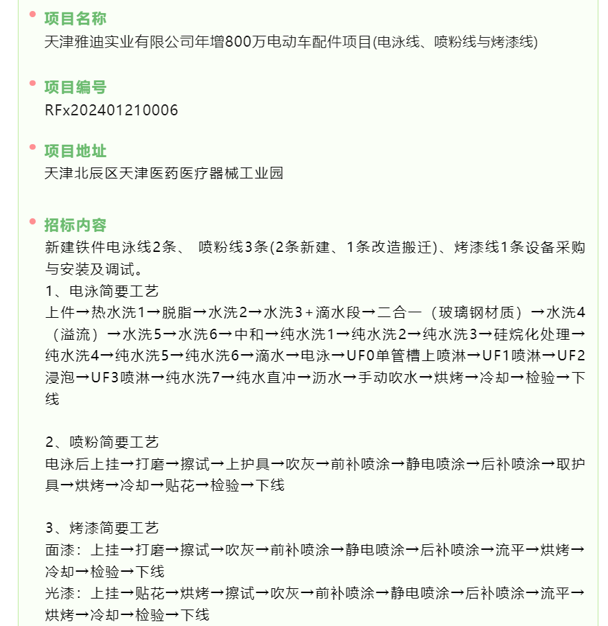 公告中指出,天津雅迪擬新建鐵件電泳線2條、 噴粉線3條(2條新建、1條改造搬遷)、烤漆線1條設(shè)備采購(gòu)與安裝及調(diào)試。歡迎符合公告要求的意向單位參加報(bào)名預(yù)審,如通過(guò)報(bào)名預(yù)審將被邀請(qǐng)參與后續(xù)的招投標(biāo)事宜。參與報(bào)名時(shí)間為2024年1月22日——2024年1月28日24:00止。