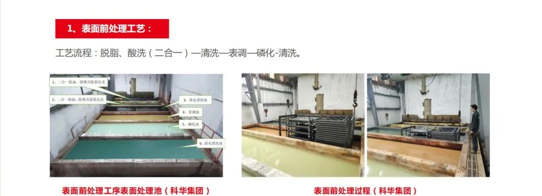 據(jù)科華集團(tuán)介紹,新型電泳噴粉復(fù)合工藝結(jié)合了酸洗、磷化前處理、表面電泳處理和靜電噴粉的優(yōu)勢(shì),采用“表面前處理+電泳噴粉復(fù)合工藝處理“的工藝流程。