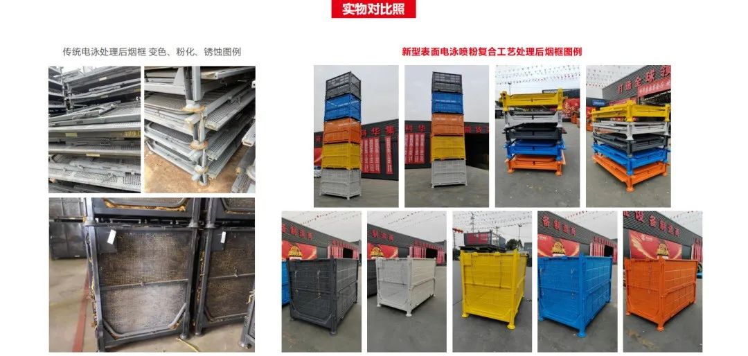 目前,各煙草公司在煙框使用過(guò)程中,普遍反映傳統(tǒng)的表面電泳處理存在電泳層變色、表面粉化、銹蝕等問(wèn)題,針對(duì)此類(lèi)問(wèn)題,科華集團(tuán)經(jīng)過(guò)多種表面處理方式的論證、試驗(yàn),開(kāi)發(fā)出一套新型表面電泳噴粉復(fù)合工藝方法,有效地解決了電泳層易變色、粉化、銹蝕的現(xiàn)象,抗腐蝕性能明顯增強(qiáng),現(xiàn)科華集團(tuán)在醫(yī)藥行業(yè)鋼制托盤(pán)、汽車(chē)行業(yè)、煙草行業(yè)(云南煙草煙葉公司)已開(kāi)始廣泛運(yùn)用。