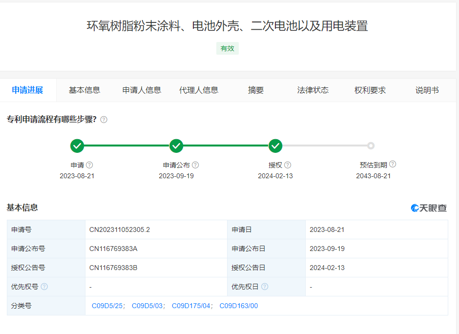 根據(jù)天眼查數(shù)據(jù)顯示,寧德時(shí)代(300750)新獲得一項(xiàng)發(fā)明專利授權(quán),專利名為“環(huán)氧樹(shù)脂粉末涂料、電池外殼、二次電池以及用電裝置”,專利申請(qǐng)?zhí)枮镃N202311052305.2,授權(quán)日為2024年2月13日。