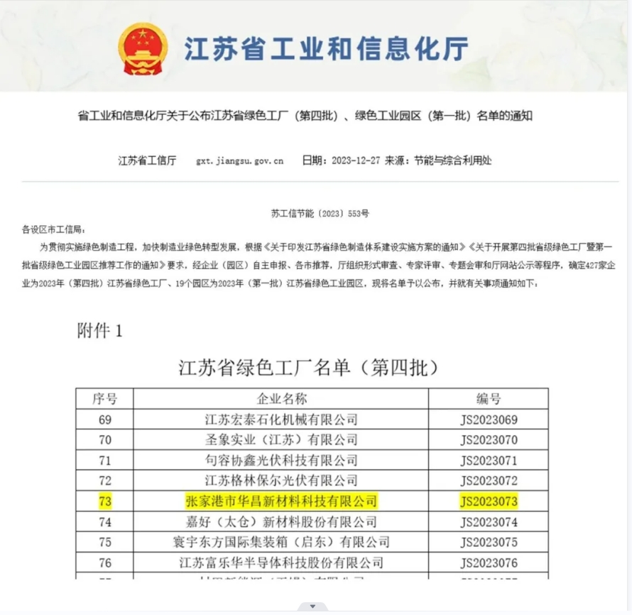 2023年12月27日,江蘇省工信廳公布了2023年度第四批綠色制造名單,其中張家港市華昌新材料科技有限公司赫然在列,成為少數(shù)幾家獲得“江蘇省綠色工廠”認(rèn)證的企業(yè)之一。這一榮譽(yù)是對華昌新材料公司在環(huán)保與可持續(xù)發(fā)展方面所做出的卓越貢獻(xiàn)的肯定,也是對公司長期以來堅持綠色創(chuàng)新發(fā)展、積極履行社會責(zé)任的褒獎。