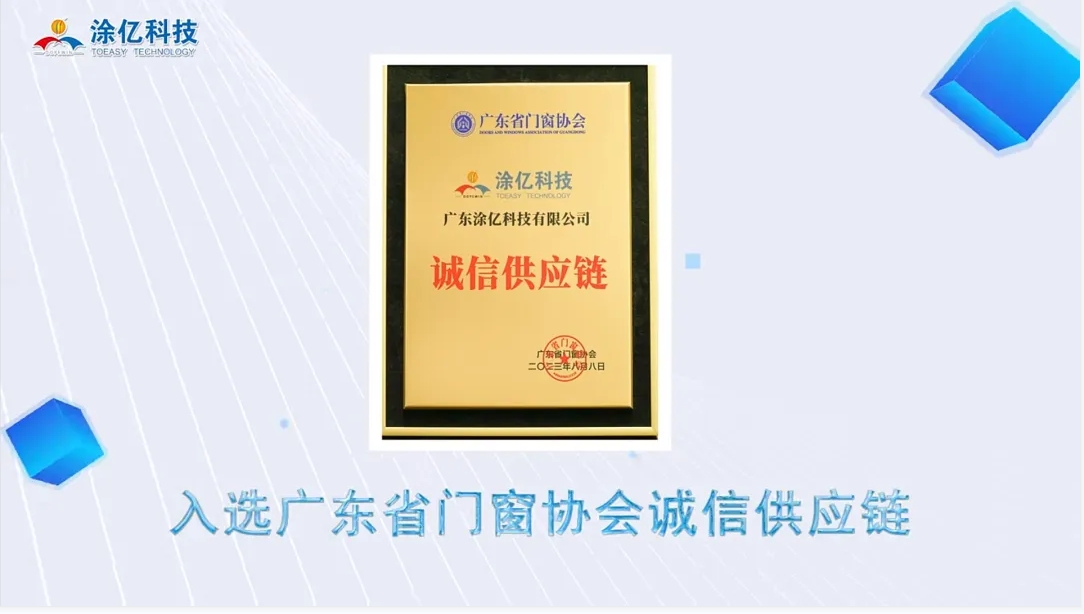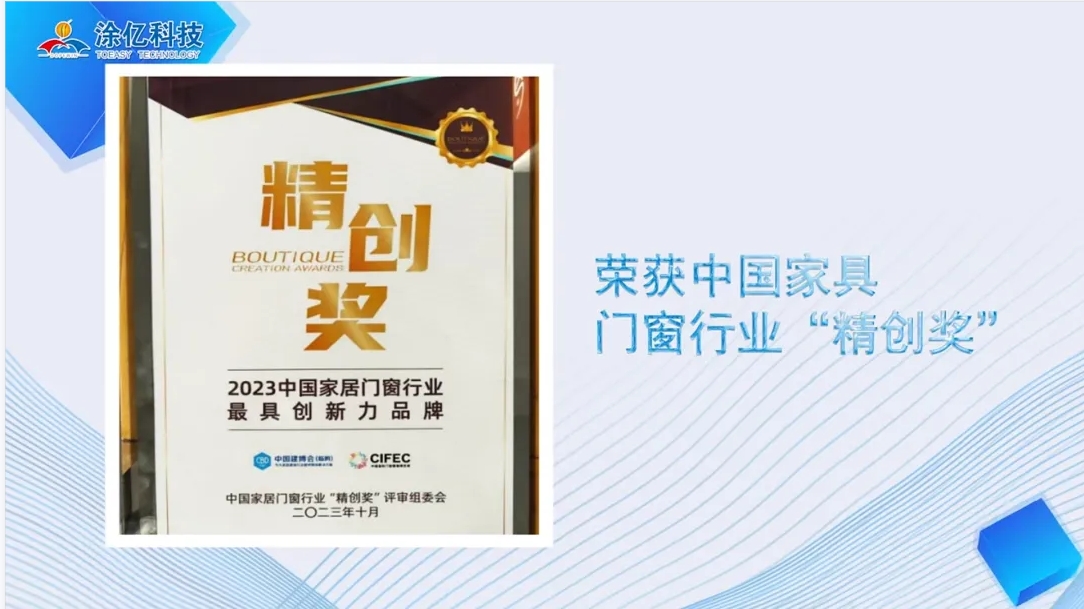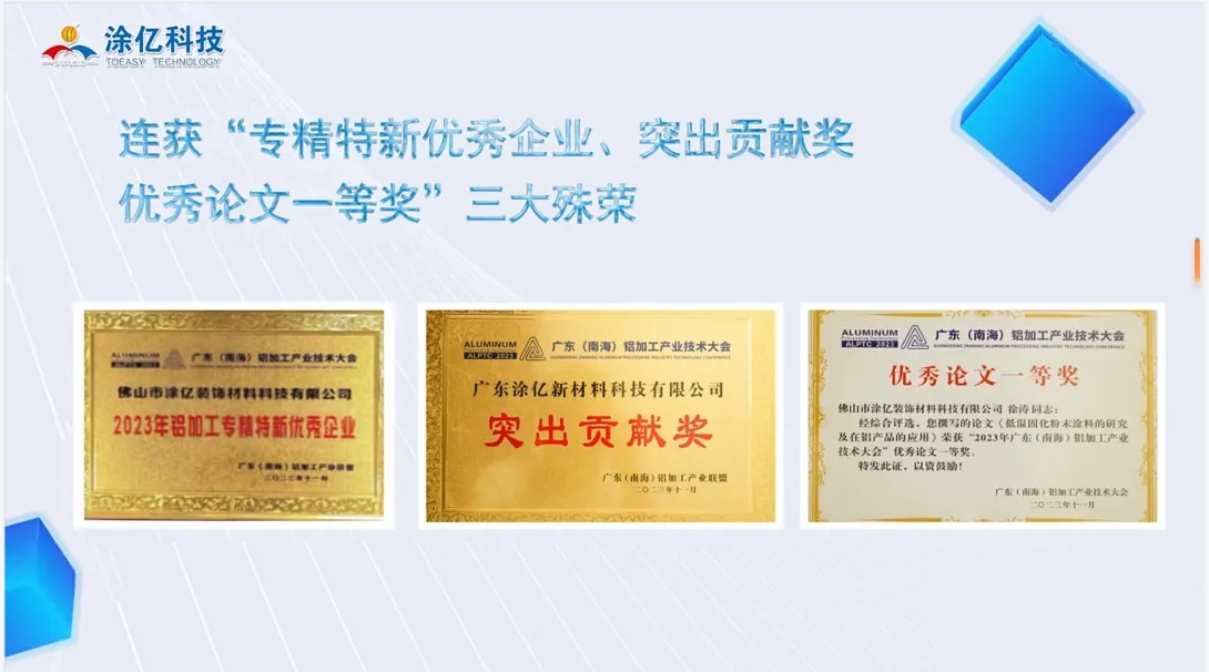 2023年,涂億科技以其卓越的表現(xiàn)和持續(xù)的努力,贏得了眾多榮譽(yù)和獎(jiǎng)項(xiàng),充分展現(xiàn)了其在粉末涂料行業(yè)的領(lǐng)先地位和強(qiáng)大的企業(yè)實(shí)力。公司入選廣東省門窗協(xié)會(huì)誠信供應(yīng)鏈、榮獲中國家具門窗行業(yè)“精創(chuàng)獎(jiǎng)”、連獲“專精特新優(yōu)秀企業(yè)、突出貢獻(xiàn)獎(jiǎng)、優(yōu)秀論文一等獎(jiǎng)”三大殊榮、獲得中國綠色產(chǎn)品認(rèn)證,產(chǎn)品符合IATF16949:2016質(zhì)量管理體系標(biāo)準(zhǔn)認(rèn)證,榮獲第五屆“佛山高新技術(shù)進(jìn)步獎(jiǎng)”二等獎(jiǎng)和獲得中國有色金屬工業(yè)科學(xué)技術(shù)二等獎(jiǎng)等等。