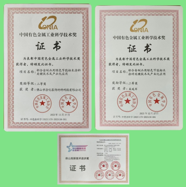 2022年8月涂億科技主導(dǎo)《鋁合金制品用綠色節(jié)能粉末涂料關(guān)鍵技術(shù)及產(chǎn)業(yè)化應(yīng)用》項(xiàng)目由中華人民共和國科學(xué)技術(shù)部中國有色金屬學(xué)會(huì)評(píng)為:該項(xiàng)目整體技術(shù)達(dá)到國際先進(jìn)水平、其中低溫固化與超細(xì)粉末一體化技術(shù)達(dá)到國際領(lǐng)先水平。繼該項(xiàng)目榮獲2023年度中國有色金屬工業(yè)科學(xué)技術(shù)獎(jiǎng)二等獎(jiǎng)后,又榮獲第五屆“佛山高新技術(shù)進(jìn)步獎(jiǎng)”二等獎(jiǎng)。