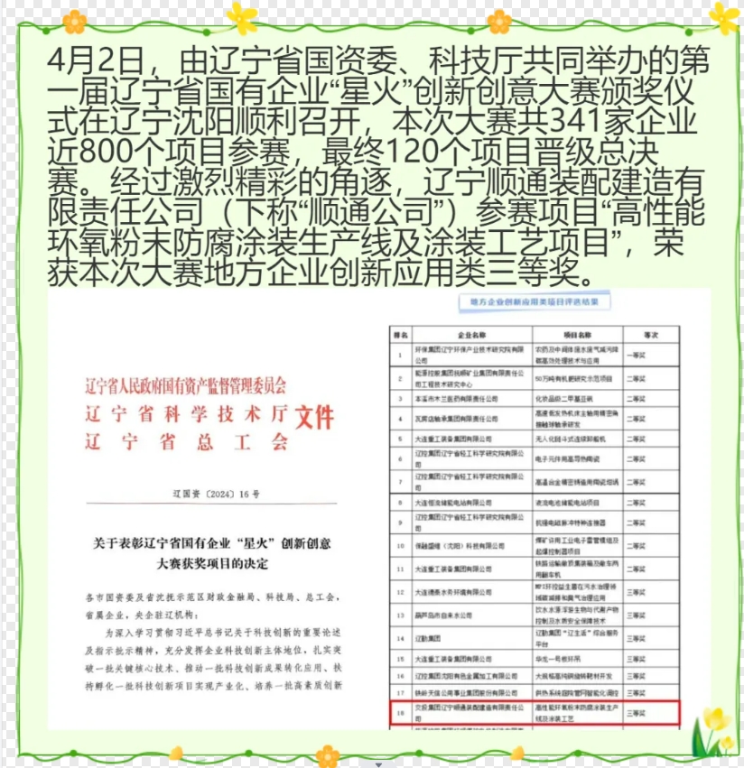 同時(shí),順通公司高性能環(huán)氧粉末防腐涂裝生產(chǎn)線及涂裝工藝項(xiàng)目的獲獎(jiǎng)與企業(yè)多年來(lái)堅(jiān)持創(chuàng)新的理念分不開(kāi)。
