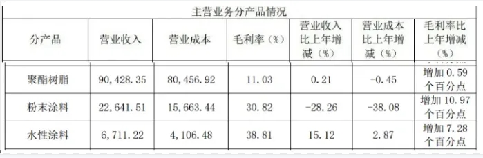 根據(jù)披露,聚酯樹脂業(yè)務(wù)2023年實現(xiàn)營業(yè)收入9.04億元,同比增長0.21%;粉末涂料業(yè)務(wù)實現(xiàn)營業(yè)收入2.26億元,同比下滑28.26%;水性涂料業(yè)務(wù)實現(xiàn)營業(yè)收入6711.22萬元,同比增長15.12%。