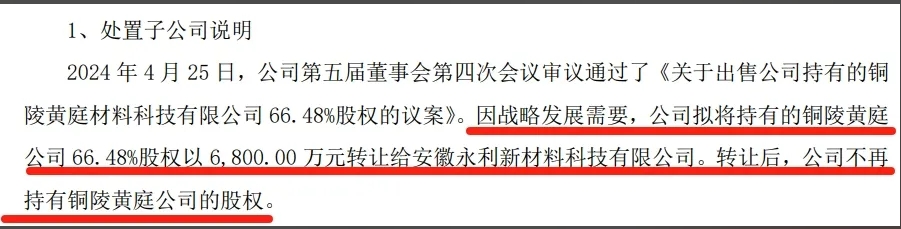 2024年4月25日,泰達(dá)新材第五屆董事會第四次會議審議通過了《關(guān)于出售公司持有的黃庭銅陵材料科技有限公司66.48%股權(quán)的議案》。因戰(zhàn)略發(fā)展需要,公司擬將持有的銅陵公司66.48%股權(quán)以6800萬元轉(zhuǎn)讓給安徽永利新材料科技有限公司。轉(zhuǎn)讓后,公司不再持有銅陵公司的股權(quán)。