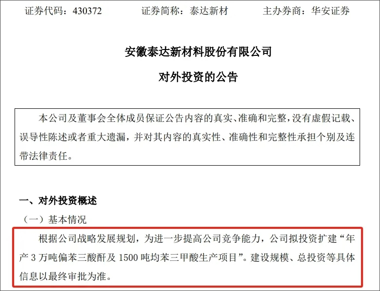 2023年5月8日,泰達(dá)新材對外發(fā)布《對外投資的公告》。公告中指出,根據(jù)公司戰(zhàn)略發(fā)展規(guī)劃,為進(jìn)一步提高公司競爭能力,公司擬投資擴(kuò)建“年產(chǎn)3萬噸偏苯三酸酐及1500噸均苯三甲酸生產(chǎn)項目”。建設(shè)規(guī)模、總投資等具體信息以最終審批為準(zhǔn)。