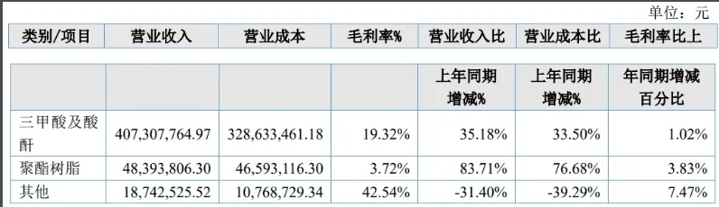 根據(jù)披露,泰達(dá)新材的營業(yè)收入主要來自于銷售三甲酸及酸酐產(chǎn)品。此外,由于泰達(dá)新材控股子公司黃庭銅陵材料科技有限公司(下稱“銅陵公司”)“年產(chǎn)12萬噸飽和聚酯樹脂項目”一期投入試生產(chǎn),2023年聚酯樹脂營業(yè)收入同比增長83.71%。