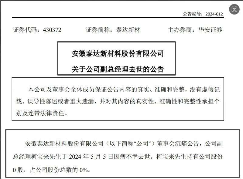 2024年5月7日,安徽泰達(dá)新材料股份有限公司(下稱“泰達(dá)新材”)對外發(fā)布《關(guān)于公司副總經(jīng)理去世的公告》。