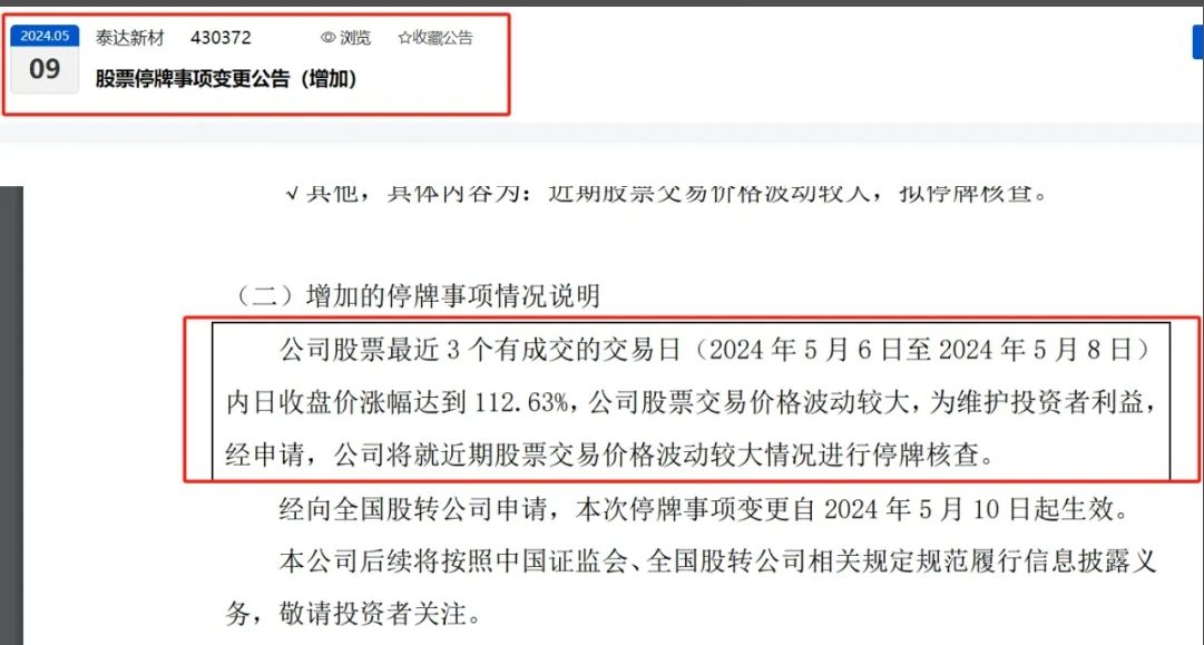 2024年5月9日,泰達(dá)新材對外發(fā)布《股票停牌事項變更公告(增加)》指出,公司股票最近3個有成交的交易日(2024年5月6日至2024年5月8日)內(nèi)日收盤價漲幅達(dá)到112.63%,公司股票交易價格波動較大,為維護(hù)投資者利益,經(jīng)申請,公司將就近期股票交易價格波動較大情況進(jìn)行停牌核查。