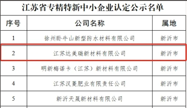 2023年12月,江蘇省工信廳公示了江蘇省2023年“專(zhuān)精特新”中小企業(yè)獲批名單,江蘇達(dá)美瑞新材料有限公司獲批省級(jí)“專(zhuān)精特新”企業(yè)。