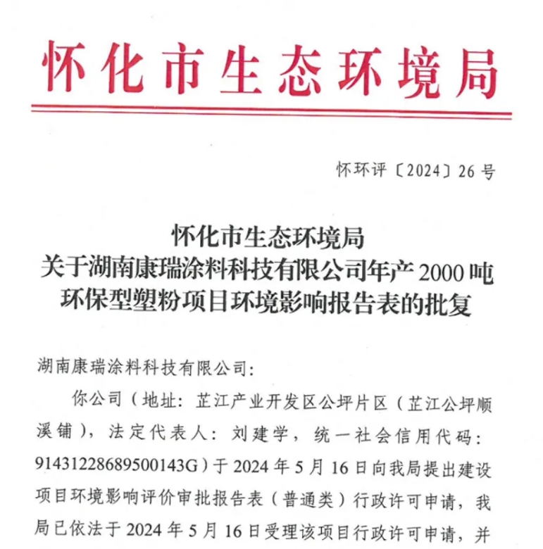 2024年5月31日,懷化市生態(tài)環(huán)境局對外發(fā)布《關(guān)于湖南康瑞涂料科技有限公司年產(chǎn)2000噸環(huán)保型塑粉項目環(huán)境影響報告表的批復(fù)》。