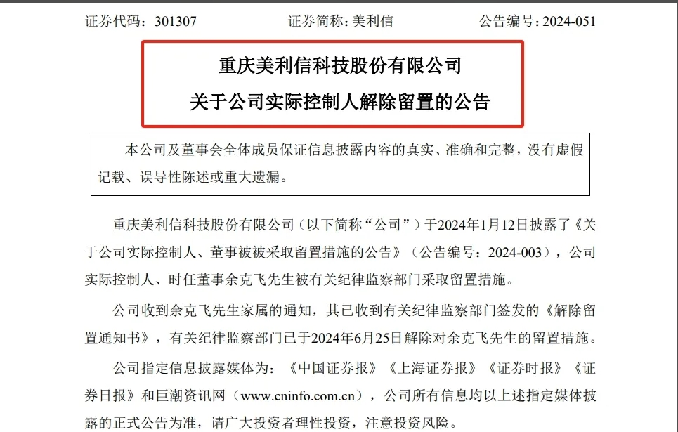公告中指出,美利信于2024年1月12日披露了《關(guān)于公司實際控制人、董事被被采取留置措施的公告》,公司實際控制人、時任董事余克飛先生被有關(guān)紀(jì)律監(jiān)察部門采取留置措施。公司收到余克飛家屬的通知,其已收到有關(guān)紀(jì)律監(jiān)察部門簽發(fā)的《解除留置通知書》,有關(guān)紀(jì)律監(jiān)察部門已于2024年6月25日解除對余克飛的留置措施。