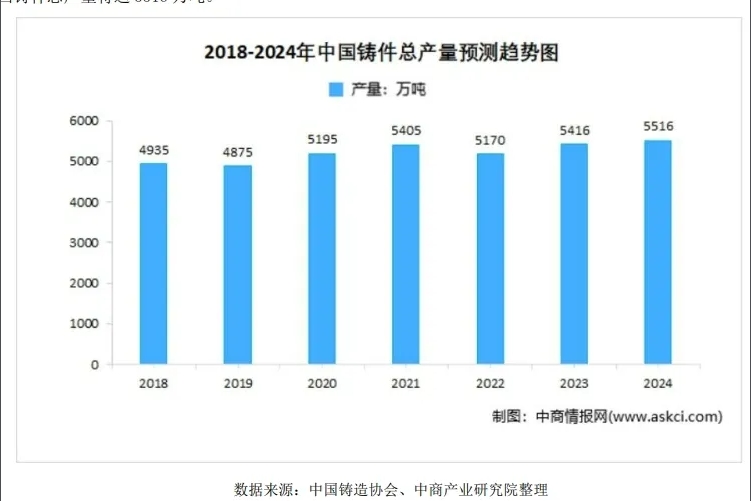 經(jīng)過70余年的發(fā)展,我國壓鑄行業(yè)在企業(yè)素質(zhì)、管理水平、工藝技術(shù)、產(chǎn)品質(zhì)量等諸多方面均有長足的進(jìn)步,已成為世界上壓鑄件的生產(chǎn)和消費大國之一。當(dāng)前及今后一段時期,我國汽車、通信等行業(yè)仍將保持快速發(fā)展,尤其是新能源汽車、5G通信技術(shù)、儲能等行業(yè)的迅猛發(fā)展,加之其他工業(yè)領(lǐng)域的壓鑄件用量快速增長,為我國的壓鑄行業(yè)帶來廣闊的市場空間。根據(jù)中國鑄造協(xié)會、中商產(chǎn)業(yè)研究院分析師預(yù)測,2024年我國鑄件總產(chǎn)量將達(dá)5516萬噸。