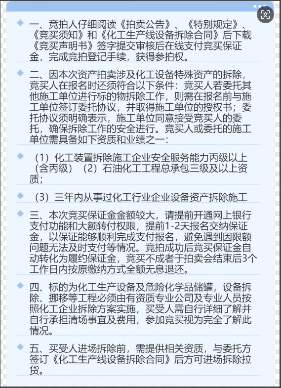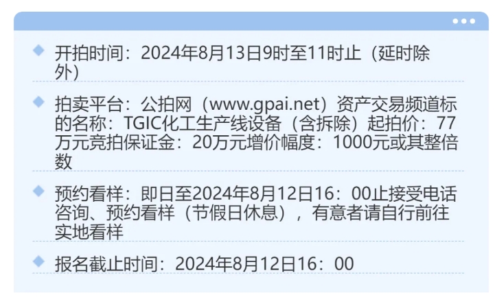 趣涂料(趣涂網)注意到,近日,公拍網上有TGIC化工生產線設備(含拆除)在拍賣,起拍價77萬元,保證金20萬元。根據披露,拍賣標的坐落于安徽黃山市歙縣循環(huán)經濟園。