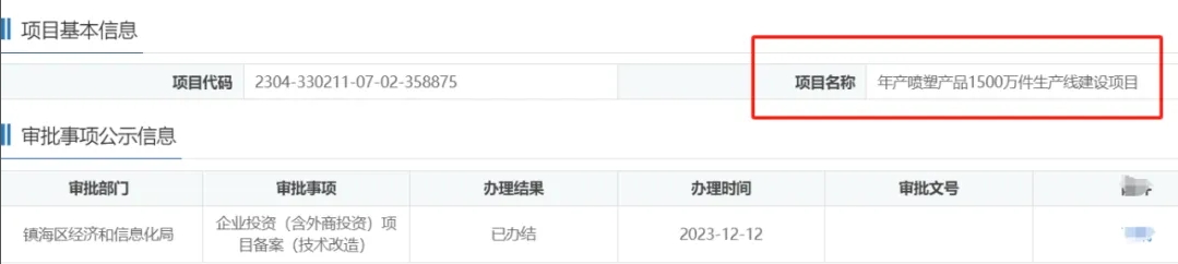 2023年12月12日,浙江鑫揚(yáng)科技有限公司,年產(chǎn)噴塑產(chǎn)品1500萬(wàn)件生產(chǎn)線建設(shè)項(xiàng)目,在鎮(zhèn)海區(qū)經(jīng)濟(jì)和信息化局,進(jìn)行企業(yè)投資(含外商投資)項(xiàng)目備案(技術(shù)改造)。