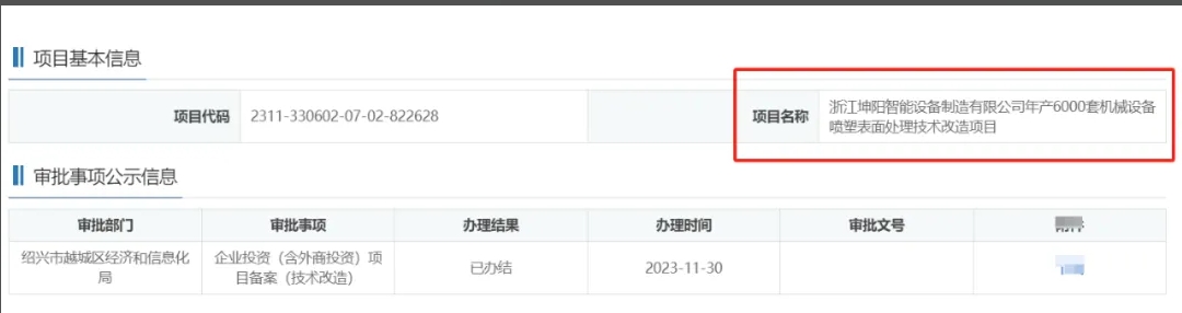 2023年11月30日,浙江坤陽(yáng)智能設(shè)備制造有限公司,年產(chǎn)6000套機(jī)械設(shè)備噴塑表面處理技術(shù)改造項(xiàng)目,在紹興市越城區(qū)經(jīng)濟(jì)和信息化局,進(jìn)行企業(yè)投資(含外商投資)項(xiàng)目備案(技術(shù)改造)。