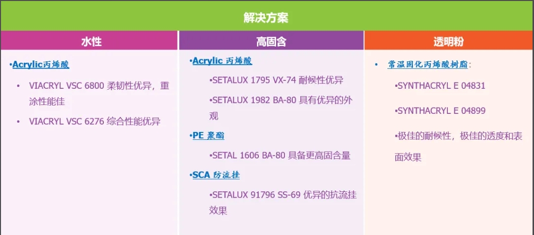 而SETAL 1606 BA-80 為PE聚酯,具備更高固含量;SETALUX 91796 SS-69 則具備優(yōu)異的抗流掛效果。
