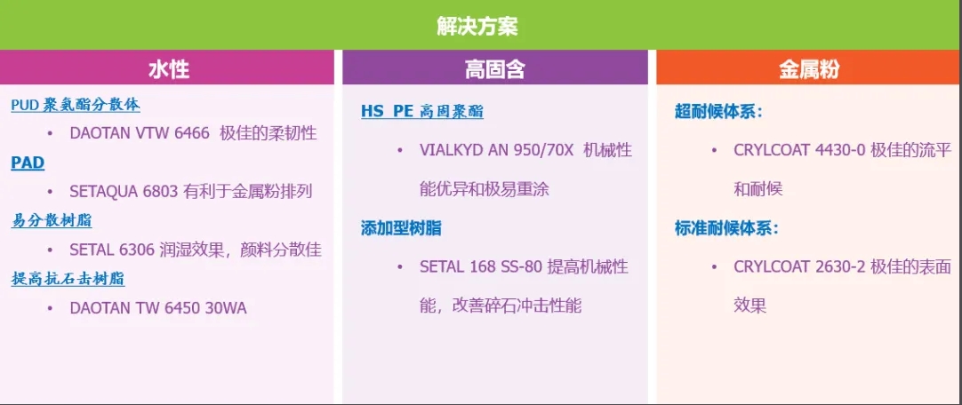 水性涂料產(chǎn)品中,DAOTAN? VTW 6466有著絕佳的柔韌性;SETAQUA? 6803非常有利于金屬粉排列;SETAL? 6306有著卓越的潤濕效果,可以讓顏料更好的分散;而DAOTAN? TW 6450 30WA則是可以提高抗石擊性能。