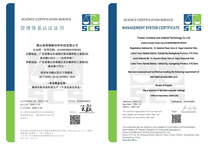 質(zhì)量認(rèn)證,讓消費(fèi)更安全、更優(yōu)質(zhì),在今年,俊美琪順利通過(guò)了國(guó)家GB/T19001-2016/ISO9001:2015體系認(rèn)證,獲得質(zhì)量管理體系認(rèn)證證書(shū),認(rèn)證所覆蓋的范圍為:裝飾用粉末涂料的生產(chǎn)(不含危險(xiǎn)化學(xué)品),再次彰顯品質(zhì)力量!