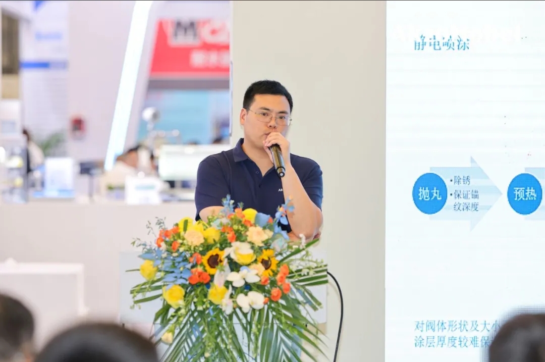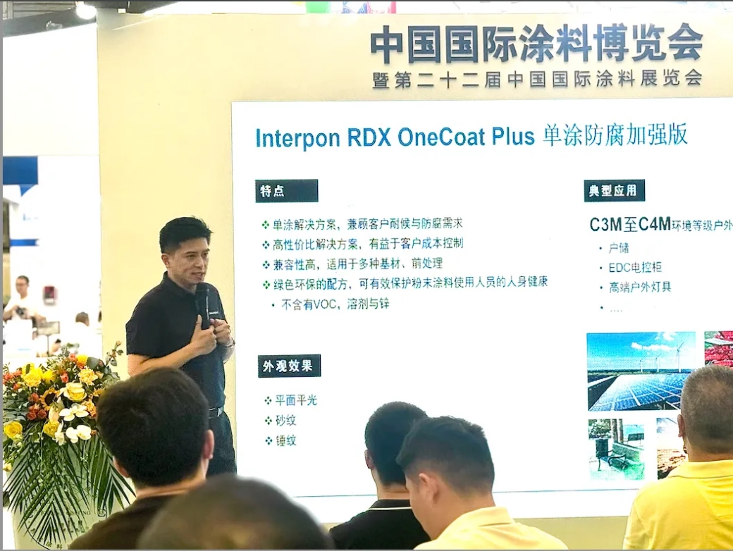 阿克蘇諾貝爾功能性粉末涂料研發(fā)經(jīng)理陳鵬飛為觀眾介紹飲用水水管粉末涂料解決方案