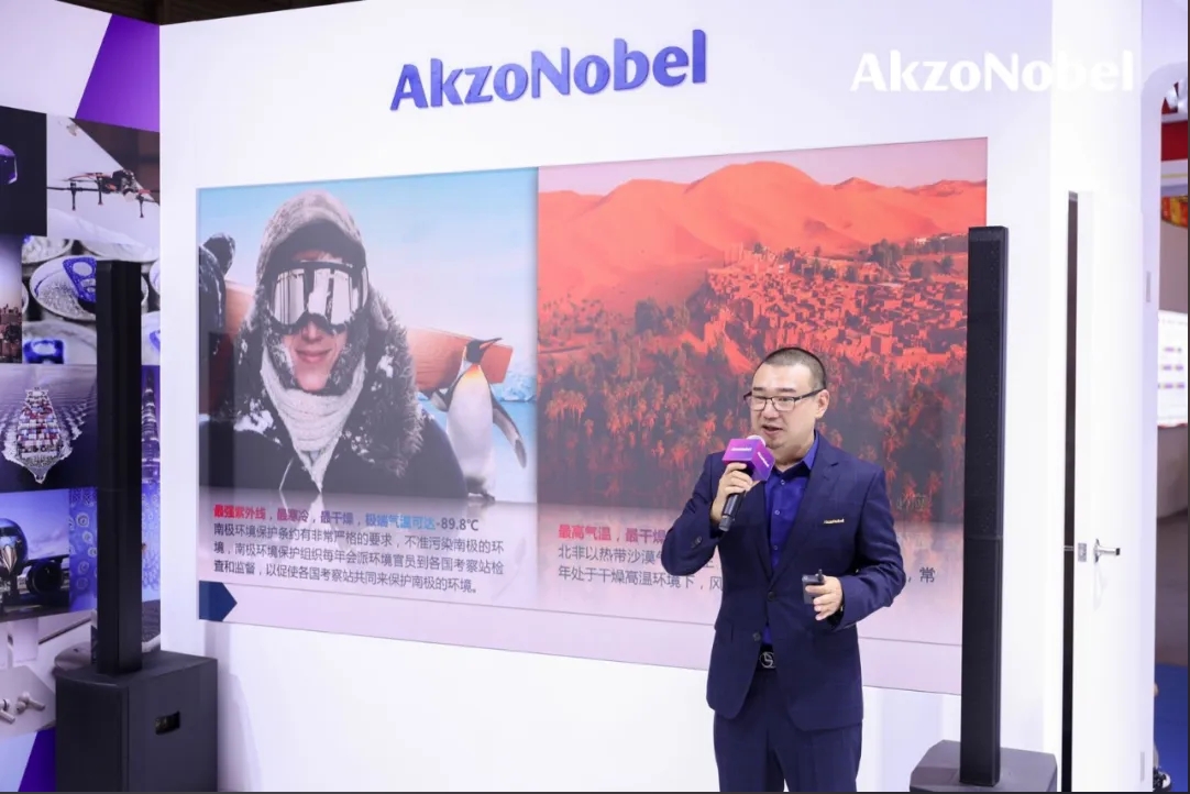 【阿克蘇諾貝爾粉末涂料建材行業(yè)中國區(qū)總經(jīng)理劉剛現(xiàn)場為觀眾介紹家裝門窗粉末涂料解決方案】