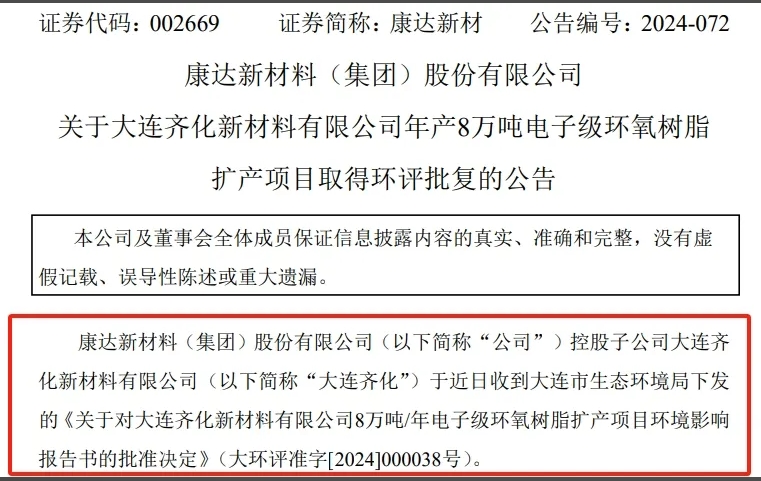 公告中指出,康達新材控股子公司大連齊化于近日收到大連市生態(tài)環(huán)境局下發(fā)的《關于對大連齊化新材料有限公司8萬噸/年電子級環(huán)氧樹脂擴產(chǎn)項目環(huán)境影響報告書的批準決定》。該批復同意大連齊化在位于大連市金普新區(qū)海青島街道金鵬路四路1號的現(xiàn)有廠區(qū)內(nèi)實施8萬噸/年電子級環(huán)氧樹脂擴產(chǎn)項目建設,要求大連齊化嚴格執(zhí)行環(huán)境保護“三同時”制度,落實批復中提出的各項安全與環(huán)保要求,按照報告書所列示建設項目的性質(zhì)、規(guī)模、地點及污染防治措施等實施項目建設。