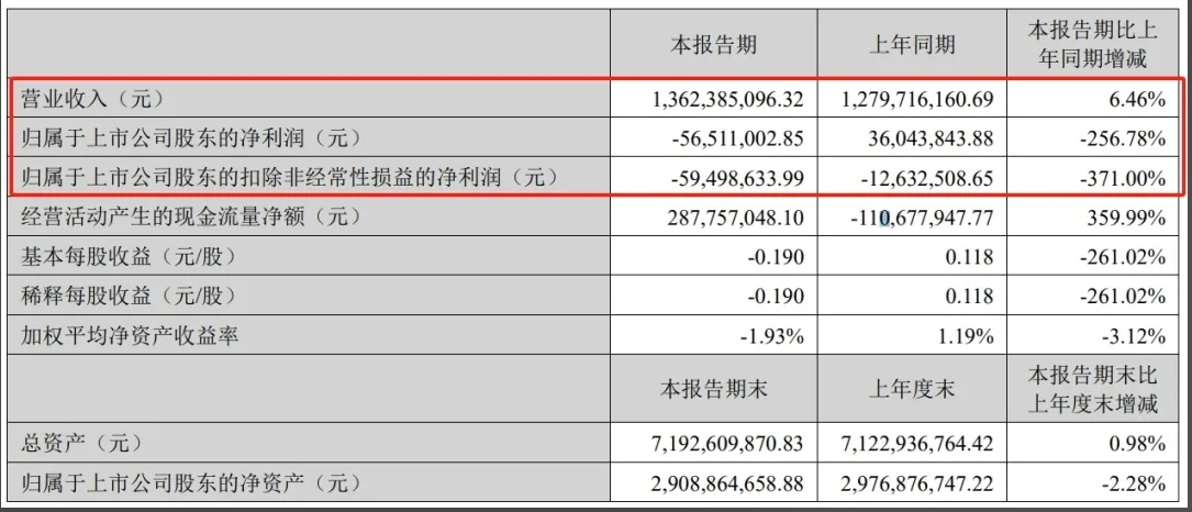 半年報中指出,康達新材2024年上半年實現(xiàn)營業(yè)收入13.62億元,同比增長6.46%;凈利潤虧損5651.1萬元,同比下滑256.78%;扣非后凈利潤虧損5949.86萬元,同比下滑371%。