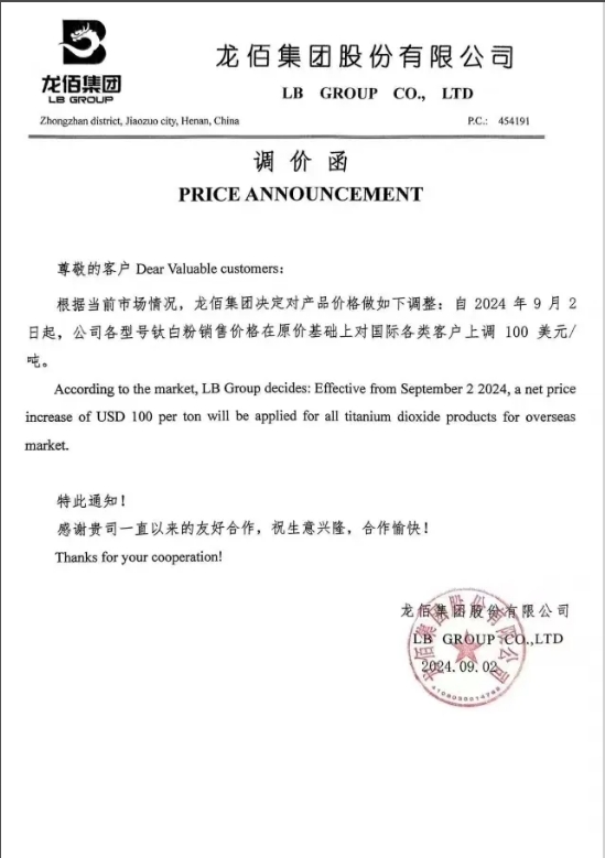 鈦白粉市場再起波動。9月2日,龍佰集團(tuán)宣布,自2024年9月2日起,公司各型號鈦白粉銷售價格在原價基礎(chǔ)上對國際各類客戶上調(diào)100美元/噸。彰顯出當(dāng)前鈦白粉國際市場的復(fù)雜態(tài)勢。