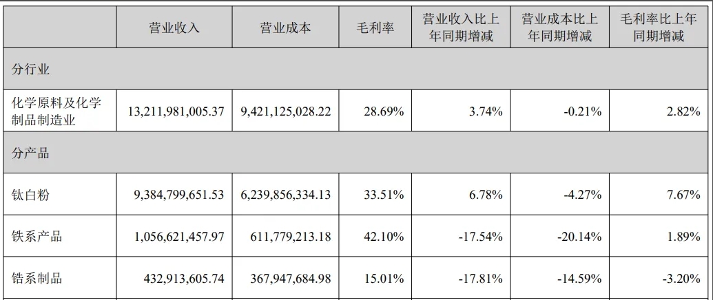 其中,鈦白粉業(yè)務(wù)實現(xiàn)營收93.85億元,同比增長6.78%,占總營收比重為68.05%;海綿鈦實現(xiàn)營收13.19億元,同比增長21.47%,占總營收比重為9.56%。
