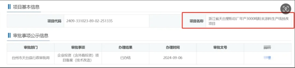2024年9月6日,浙江省天臺塑粉總廠(下稱“天臺塑粉”),年產(chǎn)3000噸粉末涂料生產(chǎn)線技改項目,在臺州市天臺縣行政審批局,進(jìn)行企業(yè)投資(含外商投資)項目備案(技術(shù)改造)。