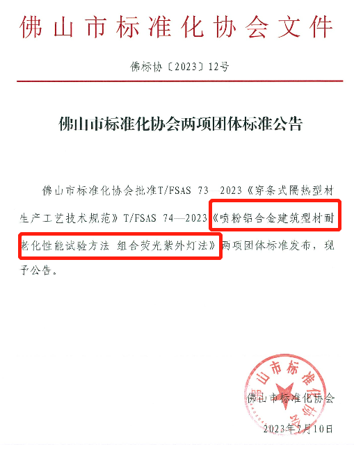近日,佛山市標(biāo)準(zhǔn)化協(xié)會(huì)批準(zhǔn)T/FSAS 74-2023《噴粉鋁合金建筑型材耐老化性能試驗(yàn)方法 組合熒光紫外燈法》團(tuán)體標(biāo)準(zhǔn)發(fā)布。2023年07月10日發(fā)布當(dāng)日即實(shí)施。通過執(zhí)行該標(biāo)準(zhǔn),建筑型材的質(zhì)量和可靠性將得到進(jìn)一步保障,從而推動(dòng)建筑型材行業(yè)的發(fā)展和提高整個(gè)建筑行業(yè)的質(zhì)量和安全水平。