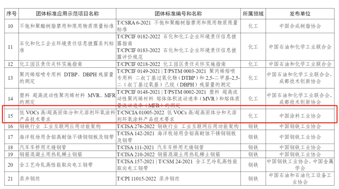 2023年12月6日工信部發(fā)布了《關(guān)于公布2023年團(tuán)體標(biāo)準(zhǔn)應(yīng)用示范項(xiàng)目的通告》。其中,T/CNCIA 01005-2022《低VOCs高/超高固體分和無溶劑環(huán)氧涂料產(chǎn)品技術(shù)要求》成功入選團(tuán)體標(biāo)準(zhǔn)應(yīng)用示范項(xiàng)目。