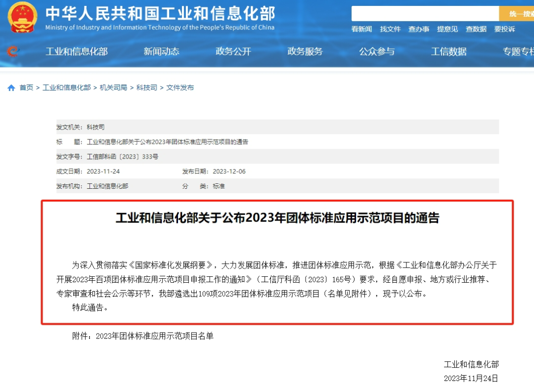 為深入貫徹落實(shí)《國家標(biāo)準(zhǔn)化發(fā)展綱要》,大力發(fā)展團(tuán)體標(biāo)準(zhǔn),推進(jìn)團(tuán)體標(biāo)準(zhǔn)應(yīng)用示范,根據(jù)《工業(yè)和信息化部辦公廳關(guān)于開展2023年百項(xiàng)團(tuán)體標(biāo)準(zhǔn)應(yīng)用示范項(xiàng)目申報工作的通知》(工信廳科函〔2023〕165號)要求,工信部開展了2023年團(tuán)體標(biāo)準(zhǔn)應(yīng)用示范項(xiàng)目的遴選工作。
